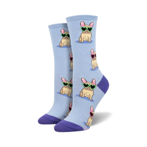 Show off yourFrenchie side in these stylish and whimsical Frenchie Fashion socks. Featuring a delightful pattern of cartoon French bulldogs adorned with heart-shaped sunglasses, these socks are sure to bring a playful pop of personality to any outfit. They're the perfect way to dress up your casual wear or add some fun to your workday look. Plus, with their comfy construction and durable materials, you'll be strutting your stuff all day long in these paw-some socks.