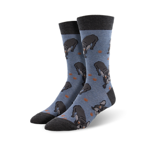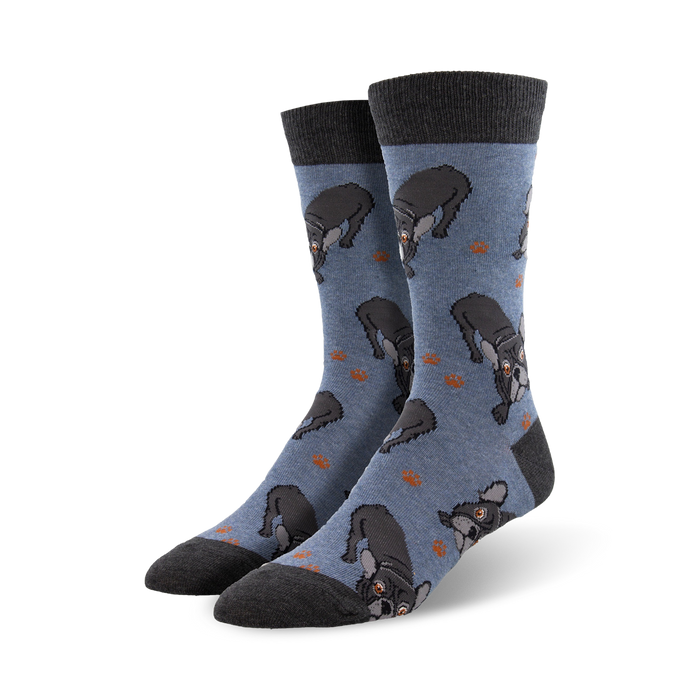 Unleash your inner Frenchie fanatic with our Frenchie Fellowship socks! Picture this: a paw-some pattern of cartoon Frenchies, lounging in style on a vibrant blue backdrop, topped off with a chic dark gray cuff. These crew socks, designed for the discerning male, are the perfect blend of fun and fashion. Get ready to steal the show, one paw step at a time!