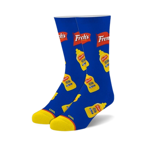 From the world-famous condiments collection, meet the "French's Yellow Mustard Socks". These crew-length socks are the epitome of both flavor and fun. Picture this: A bright yellow background adorned with cheerful mustard bottles, each topped with a vibrant red cap. A bold design guaranteed to spread happiness wherever you step. Don't just wear socks, wear a conversation starter!