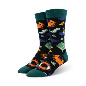Unleash your inner fisherman with these Fresh Catch socks! Dive into a sea of style with a vibrant pattern of fish, crabs, lobsters, and buoys, all set against a sleek black backdrop. The green toe and heel add a pop of color, while the orange life preserver with the word "Fresh" reminds you to stay afloat in style. These socks are the perfect catch for any fishing enthusiast or anyone who loves a playful touch in their wardrobe.