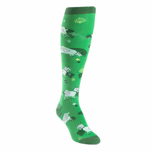 These 'Fresh Off the Goat' knee-high socks are a bright, grassy green. They're covered in a whimsical pattern of white goats frolicking amongst stylized green bushes and yellow flowers. The visible portion shows a playful design, and the cuff is a slightly darker shade of green. They're comfy enough for everyday wear, yet fun enough to make a statement. Perfect for anyone who appreciates a touch of silly charm in their socks.