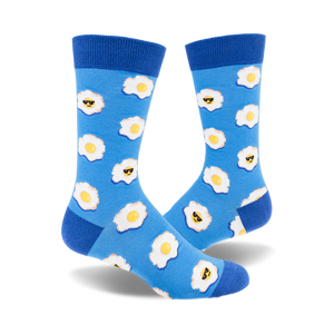 Ever noticed how a sunny-side-up egg can turn a breakfast plate into a masterpiece? Now imagine that same vibe on your feet! These playful socks bring a splash of morning cheer with their vibrant blue backdrop and a delightful pattern of fried eggs, some sporting sunglasses and cheeky smiles. Perfectly fried and full of personality, these socks are your go-to for a bright and sunny day, no matter the weather outside.