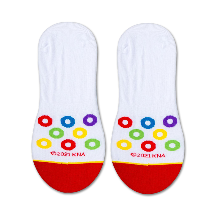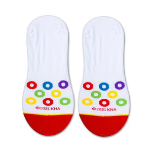 Hey cereal lovers, listen up! Get your feet into a bowl of delicious Froot Loops with our special edition Toucan Sam socks. These babies are white with a red heel and toe and covered in a colorful pattern of your favorite cereal. And just like your favorite cereal has the words "Froot Loops" emblazoned on the front, these socks have "Froot Loops" and "Cool" printed on them too. Who says you can't wear breakfast food on your feet? Liner length, women's size. Wear 'em, enjoy 'em, nom nom nom. Limited stock available, grab a pair before they vanish faster than milk in a bowl of cereal.