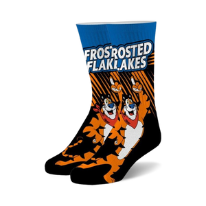 A pair of crew socks showcasing Tony the Tiger from Frosted Flakes cereal. The socks are mainly black with orange tiger stripes and blue accents. }}