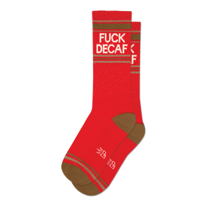 You know the drill. Skip the sleepy vibes and go straight for the punch with these bold red socks. They feature crisp white lettering that clearly spells out 'FUCK DECAF' across the upper calf, making a loud and proud statement. You'll also spot a few strong brown stripes accenting the top and wrapping around the heel and toe, which are also in matching brown. Down by the ankle on this side, small, simple cup or mug icons are visible in white, adding a subtle nod to your preferred morning ritual. These socks are for anyone who understands that decaf is just a suggestion, not a lifestyle choice.