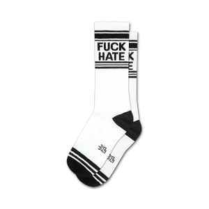Put the hate to bed with these socks with a message, showcasing the bold statement FUCK HATE in black and white. Great for any fierce advocate of love and positivity, these socks are the perfect way to make a statement. They're sure to get conversations going, and the best part? You'll be comfortable while doing it, thanks to their cozy fabric. Slip into a pair and start spreading the love!