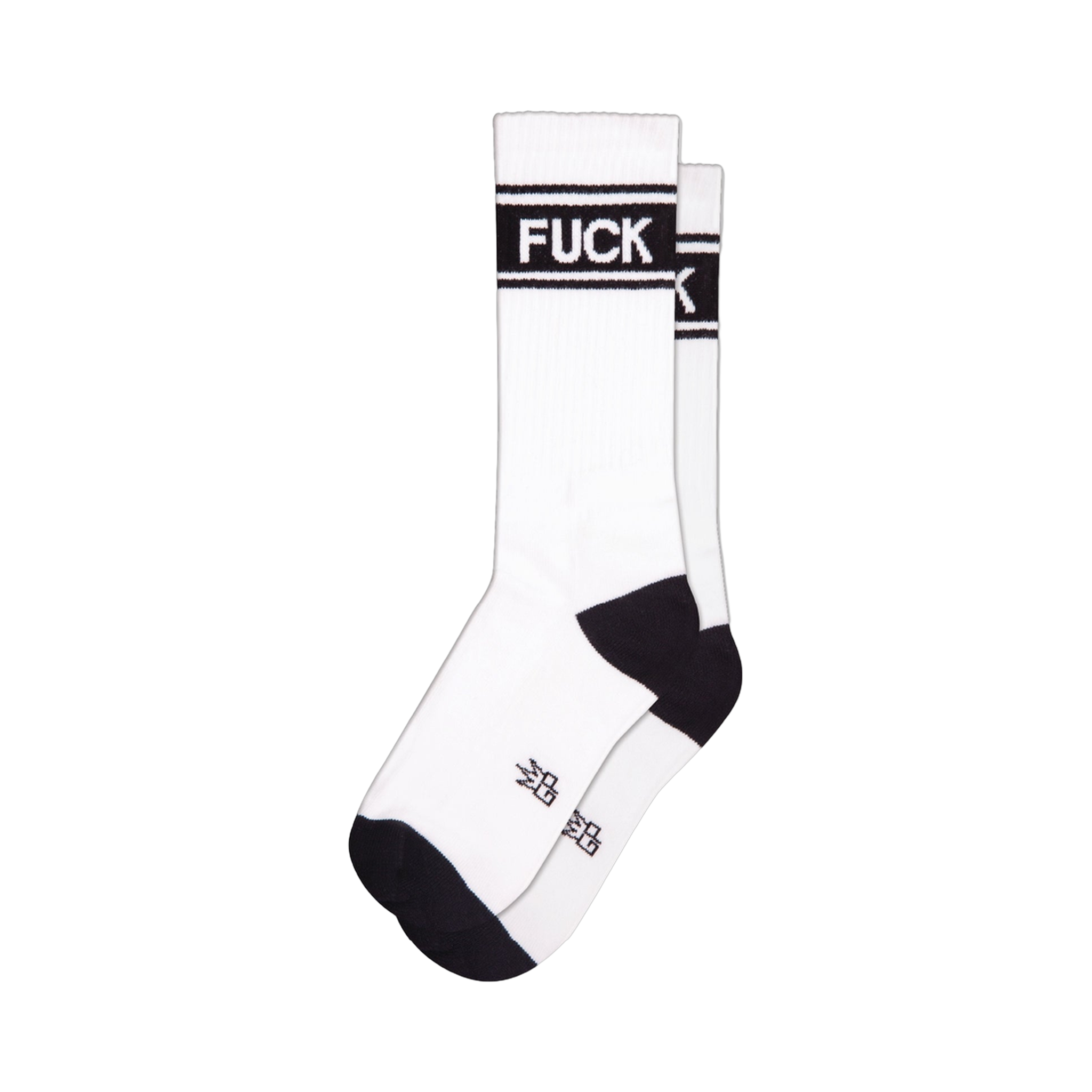 These aren't your grandma's socks. White crew socks with a bold black band reading 'FUCK' across the top. The visible portion shows a simple, clean design. The cuffs and toes are black. They're comfortable enough for everyday wear, and let's be honest, they make a statement. Simple. Direct. And undeniably you.