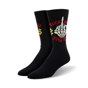 Give the finger to the world with these sassy black socks. Featuring red and yellow text with a middle finger graphic, these socks are sure to get a reaction. They're perfect for the office prankster, the sassy friend, or anyone who just wants to add a little attitude to their wardrobe. But be warned, these socks are not for the faint of heart. They're guaranteed to turn heads, so only wear them if you're ready to handle the attention! They are a one size fits most.