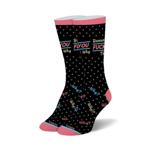 You're strolling down the street with serious swag, but your socks are making a laughingstock of you? Don't let your footwear be the punchline! Slip on these 'Fuck You That's Why' black socks with hot pink toes, heels, and soles. They let everyone know that you don't care what they think! They're like a big 'eff you' to the world and a reminder to you that you're the coolest cat in town. Nobody will ever ask you 'Why?' again because this pair of socks says it for you!