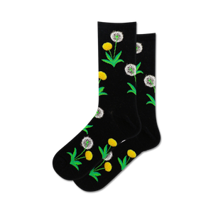 Feel the sunny spring energy with these delightful Fuzzy Dandelion socks. With their fun black background and yellow and white dandelion pattern, these socks will give you the hop you need to spring into action. Dandelions are resilient and can pop up in the unlikeliest places, so why not channel that energy and wear these socks with pride.