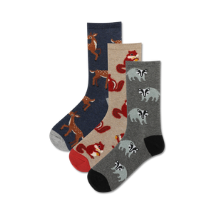 Fuzzy Woodland Animal 3 Pack Socks: These socks are just wild about woodland creatures! Three patterns of deer, raccoons and badgers, oh my! in blue, brown, and gray feature these cuties in a cozy crew sock. Cozy up with these woodland friends and explore the great indoors (or outdoors) in style. Available in women's sizes, these socks are perfect for anyone who loves animals, nature or just plain cozy socks.