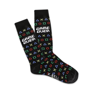 Sock it to 'em with these quirky "Game Over" socks! Featuring a playful pattern of colorful video game controller icons on a black backdrop, these crew socks are sure to score extra points with any gamer. Show off your passion for gaming or gift them to a fellow player - they're a surefire way to level up your sock game.