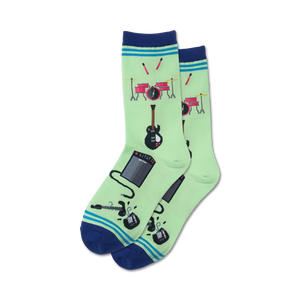 Kick boredom to the curb with Garage Band socks! These light green socks with blue stripes rock a pattern of guitars, drums, and amps. Unleash your inner rockstar and let the good times roll, baby!