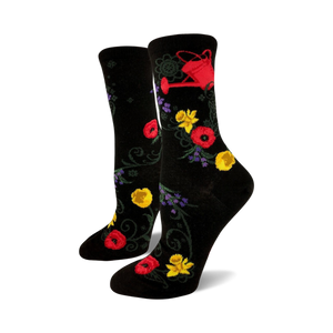 Gardeners with a knack for making their green thumb grow will have Garden Goals with these novelty socks. With red, yellow, and purple flowers set against a snazzy black background, these socks flaunt the tools and blooms of your favorite outdoor hobby in style. The purple and red watering can will make your tootsies smile and get you jumping right out of your gardening shoes (don't worry because these socks are machine washable).