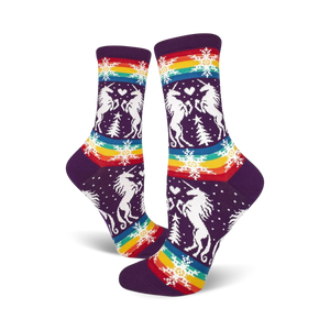 Strut your stuff in these Gay Apparel crew socks for women, featuring a pattern of two unicorns facing each other with a Christmas tree between them, all set against a backdrop of snowflakes and rainbow stripes. These purple socks are a festive and fun way to celebrate the holiday season and show off your pride. Fun fact: Unicorns are mythical creatures that symbolize magic, purity, and innocence.