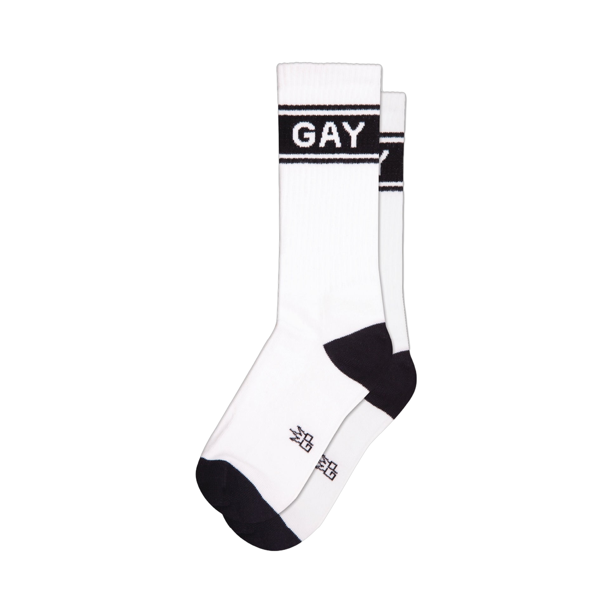 These aren't your grandma's socks. The 'Gay' socks are simple- bold black lettering on a crisp white background- with a black cuff. The visible part of the design is a classic athletic stripe look. They're crew socks, shown with a dark navy or black toe and heel. They're comfortable, and frankly, pretty darn stylish. A subtle way to show your pride- or just rock some cool socks.
