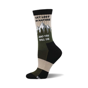 Ready to trek the unbeaten path with a cheeky twist? Our 'Get Lost In Nature... and You Will Die' socks are your perfect trekking companion. Featuring ominous yet humorous phrasing amidst a striking landscape of dark olive green mountains and pine trees, these crew-length conversation starters are ideal for your next outdoor adventure or as a playful gift to your nature-loving pals. Who knew a warning could look so stylish? Don't just stand there - let your feet shout out your wild side!