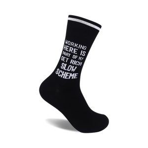 Ever gazed at your cubicle walls and realized the only one watching back is your computer screen? Fear not, with our Get Rich Slow socks, you can wear your dreams on your feet. These black and white crew socks let everyone know you're just biding your time until you can quit and travel the world. We're not saying you'll strike gold, but they'll definitely add a spring to your step and give your boss a chuckle. And who knows, they might even inspire a few coworkers to join your quest for early retirement!