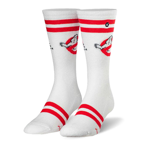 Deck out your feet with some classic pop culture cool. These white crew socks bring that undeniable Ghostbusters charm, sporting the iconic no-ghost logo proudly on the calf. You also get a timeless varsity look with two bold red stripes near the top cuff and another pair of red stripes closer to the toe. It's a clean, casual design, perfect for showing off your fandom with a sporty feel.
