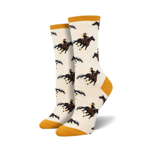 Giddy up and ride off into a sunset of style with these yeehaw-worthy socks. Featuring a cowboy galloping atop a trusty steed, these white socks with a yellow top and brown heel and toe embody the spirit of the Wild West. A perfect gift for any cowgirl or rodeo enthusiast, these socks bring the adventure of the frontier to your feet, reminding you to saddle up and seize the day!