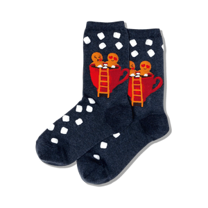 Meet the Gingerbread Couple Crew Socks: A sweet, festive pair that's perfect for the holiday season. These dark blue socks with white polka dots feature a gingerbread man and woman standing in a red coffee cup with a ladder beside them. They'll be a fun and unique gift, even if you give them to yourself!