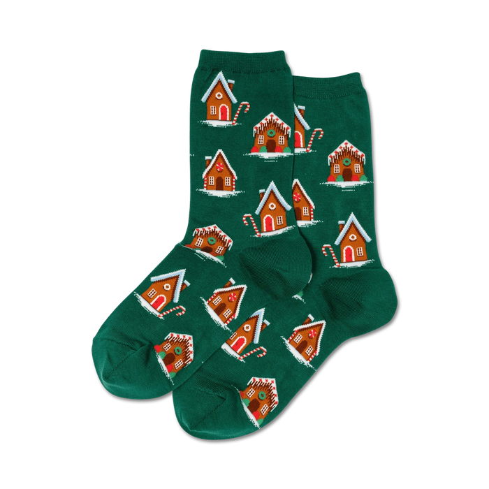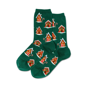 Gingerbread Houses - Holiday Cheer at Your Feet!: What do you get when you cross a pile of freshly fallen snow and a plate of gingerbread cookies? The Gingerbread Houses crew socks! Slip into a pair of these cheerful socks to brighten up even the most chilly of days. You'll feel like you're strolling through a winter wonderland with gingerbread houses lining the streets and candy canes growing on trees. Plus, who says only Santa can wear green and red on Christmas? These socks will add a fun twist to any holiday outfit. Spread a little cheer wherever you go with these festive gingerbread-themed crew socks.