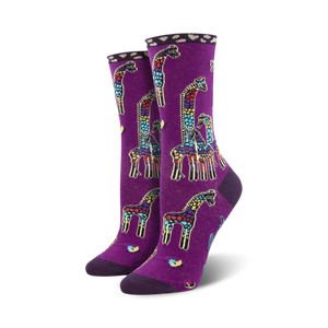 Unleash your wild side with these Giraffe Family socks! These vibrant crew socks feature a whimsical pattern of geometric giraffes prancing around in purple. Wear these socks to add a touch of fun and whimsy to your everyday look, or gift them to a giraffe-loving friend. These socks will surely put a smile on their face and make them the talk of the town.