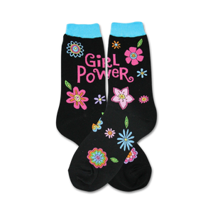 Show off your girl power with these bright and colorful socks! Featuring an array of vibrant flowers and leaves, these crew-length socks will add a fun and feminine touch to any outfit. The hot pink and blue 'Girl Power' lettering leaves no doubt of your fierce and fabulous attitude. Go ahead, be bold and show the world what you're made of with every step you take!