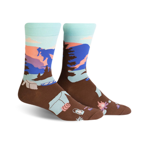 Get ready for a wild adventure with our Glacier National Park crew socks! These brown bad boys are covered in a pattern of camping essentials like tents, lanterns, and campfires, with a backdrop of majestic mountains, towering trees, and serene lakes. Perfect for the outdoorsy man who loves the great outdoors, these socks will have you saying "hike yeah!" with every step.