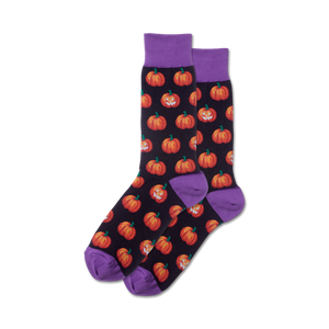 Carve out some fun this Halloween with our Glow in the Dark Pumpkin Crew Socks! These boo-tiful socks are covered in a spooky pattern of bright orange pumpkins with black stems and green leaves, all on a black background. With purple toes, heels, and cuffs, these socks are the perfect way to add a touch of spooky style to your Halloween costume or everyday look.