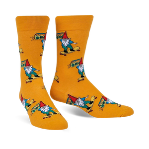 Gnarly Gnomes Socks: The perfect socks for the gnarliest of gnomes! These crew length socks feature a pattern of cartoon gnomes skateboarding, complete with red and blue hats, green shirts, and yellow skateboards. They're the perfect way to add a touch of fun and whimsy to your outfit, and they're sure to make you smile every time you put them on. Plus, they make great gifts for any gnome-lover in your life. And here's a fun fact: Did you know that gnomes are sometimes associated with good luck and prosperity? So, by wearing these socks, you're not only expressing your personal style, but you might also be attracting some good fortune.