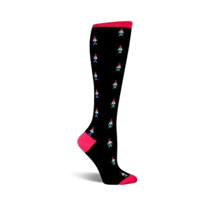 To gnome me is to love me. These fun knee high socks won't sell you short, gnome pun intended! Each cool pair of all black socks features a pattern of tiny gnomes in a few different colored outfits with hot pink detailing at the band, heel, and toe.