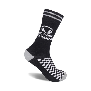 **Go Away I'm Gaming Socks Description:** Get ready to level up your sock game with our epic 'Go Away I'm Gaming' socks! These black beauties feature white text that screams 'GO AWAY I'M GAMING', letting everyone know you're on a serious gaming mission. Complete with a white and gray checkered pattern and two gray stripes, these socks will make you the envy of your gaming squad. Grab a pair and let the world know to stay away - you're too busy saving the pixelated universe.