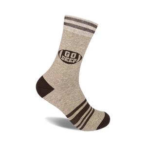 Go Deep! socks are like a touchdown for your feet! These stylish mid-calf socks are made with a breathable cotton blend and feature bold brown stripes and the words "Go Deep!" emblazoned on the front. They're perfect for football fans of all ages, or anyone who loves to make a statement with their socks. Plus, a portion of the proceeds from each sale goes towards supporting youth football programs. So, whether you're hitting the gridiron or just want to show your team spirit, Go Deep! socks are sure to become your new favorites.
