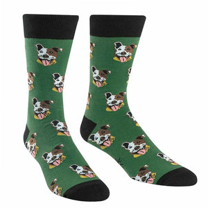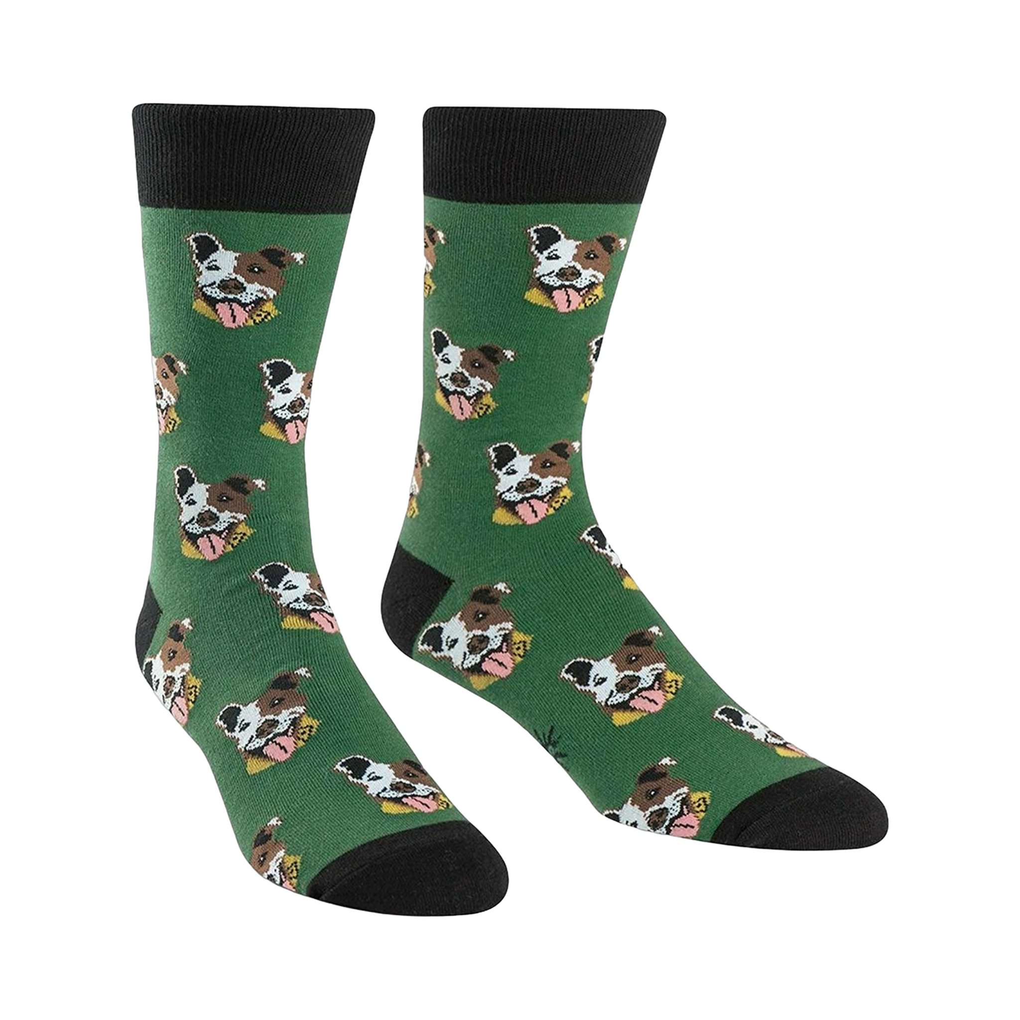 Who's a good boy? Are you a good boy!? Yes you are!! These fun novelty socks feature a pattern of very happy smiling pups waiting for a good game of fetch. The cute, all green and black colored socks goes great with walks in the park, hikes on the trail, and fetches well in the backyard.