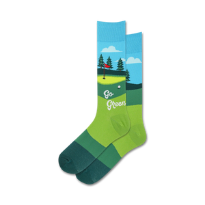 Step into the fairway with our "Go Green" novelty golf socks! These fun and sporty socks feature a vibrant green golf course, complete with fairways, greens, and pine trees. Perfect for any golf enthusiast, these socks add a touch of playfulness to your game. Whether you're hitting the links or just showing off your love of the sport, these socks are sure to make a hole-in-one impression. Go Green and brighten up your footwear!