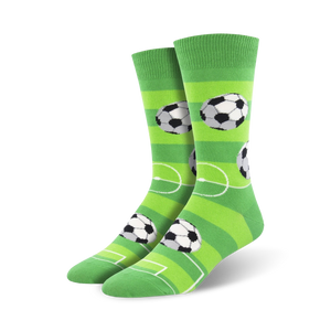Goal For It! Kick your style into high gear with these men's crew socks featuring a vibrant pattern of black-and-white soccer balls and crisp white lines on a bright green background. Whether you're a soccer enthusiast or just love fun and quirky socks, these will have you scoring style points. Fun fact: Did you know that soccer is the most popular sport in the world, with over 3.5 billion fans? Show your love for the beautiful game with these spirited socks.