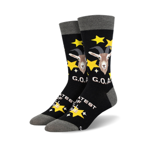 Brighten your feet with these sprightly sock stars - the G.O.A.T. (Greatest Of All Time) socks. Gear up in these comfy crew-length socks, strut your stuff, and let the world know who's the real G.O.A.T. with the cartoonish yellow party hat-wearing goat. Get ready to bleat out loud with these foot-friendly fashion statements!