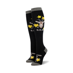 Feel like the GOAT while putting on these stylish, bold, and resilient socks that feature the word 'GOAT', a goat's head, and a starburst pattern. The words 'Greatest of All Time' are displayed vertically on the side of each sock, making it very clear that these are not your average socks. These knee-high socks are the perfect way to add some fun and personality to your outfit. And who knows, wearing these socks might just give you the confidence to finally achieve your greatness.