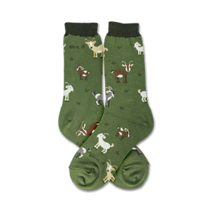 Calling all goat enthusiasts! Grab a pair of these fun and fuzzy goat socks and show your love for these adorable animals. With a dark green background and a pattern of cartoon goats in various poses, these socks are sure to bring a smile to your face. Get ready to hoof it in style with these cute and cozy goat socks!
