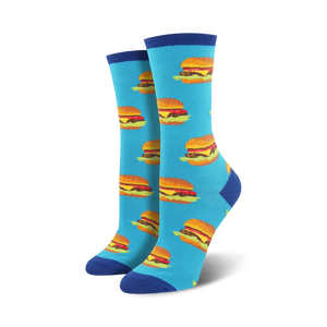 What's more heavenly than burgers going onto your feet? Ones that go in your mouth! Hamburger fans will love these cool women's novelty crew socks. Enjoy a juicy burger without worrying about packing on all the calories! Each awesome pair features fully loaded hamburgers printed all over on a light blue background. The cuffs, heels, and toe lines are dark blue.