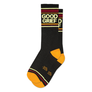Some days, you just gotta say it. And with these socks, you can say 'Good Grief' loud and clear, right on your feet. They've got a classic black base, bright orange on the toe and heel, and bold stripes in burgundy, gold, and a creamy off-white circling the cuff. The phrase 'GOOD GRIEF' is knit into the top part of the sock in a prominent font, standing out against those stripes. On the visible side, you can also spot some cool subtle geometric shapes near the arch, adding a little extra detail. These are the perfect casual socks for when life's a bit much, or just when you want to rock a fun, retro-inspired look.