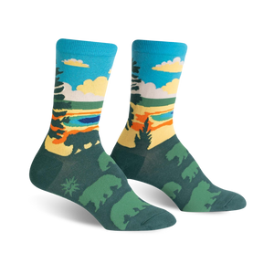 Step into a forest wonderland with our "Grand Prismatic" socks! Stroll through towering pine trees, meet friendly bears, and soak in the vibrant skies. Perfect for outdoor enthusiasts, these socks bring the wilderness to your feet. Fun fact: bears can run up to 35 mph!