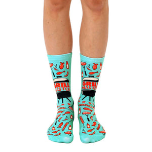 Calling all grill masters and barbecue enthusiasts! Put on a pair of our Grill Master Crew Socks and let the grilling season begin. These blue socks are adorned with a sizzling pattern of spatulas, tongs, hot dogs, hamburgers, steaks, fish, and flames. For Men and Women. Not only will these socks keep your feet cool and comfortable while you're flipping burgers and grilling steaks, but they'll also make you the talk of the backyard.