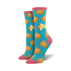 Who doesn't enjoy the warm, gooey goodness of a grilled cheese sandwich? Now you've got the perfect cheesy thing in you wardrobe to match your equally cheesy personality! Each fun pair of women's novelty crew socks features grilled cheese sandwiches printed all over on a teal blue background. The cuffs, heels, and toe lines are maroon. These awesome would be perfect to wear on National Grilled Cheese Day, which is April 12!