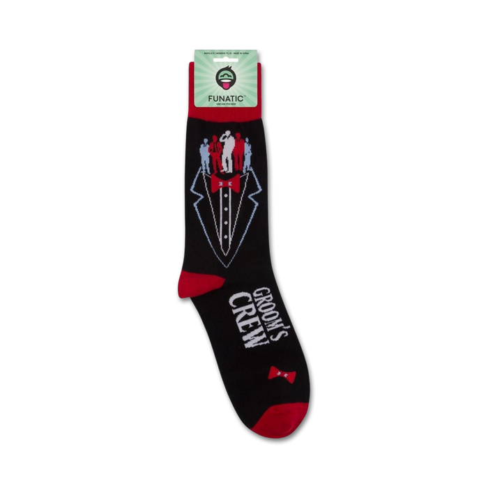 Get ready to tie the knot in style with these hilarious Groom's Crew Silhouette socks! These socks are the perfect way to add a touch of fun and personality to your wedding attire. Featuring a sleek black background with a crisp white tuxedo print, these socks are sure to turn heads as you walk down the aisle. The red toe and heel add a pop of color, while the printed words "Groom's Crew" leave no doubt about your special role in the wedding party. These socks are made for mens and are available in crew length, so you can feel comfortable and confident all day long. Whether you're the groom, a groomsman, or just a guest, these Groom's Crew Silhouette socks are sure to be a hit!