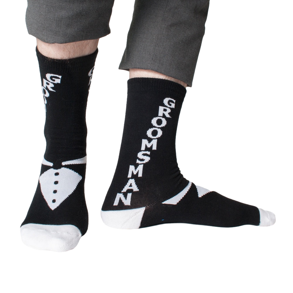 Show your groomsmen that you appreciate them as much as the best man. These fun men's novelty crew socks make the perfect gifts for your wedding entourage. Each cool pair features the word "GROOMSMAN" printed on the sides in white letters against a stylish black background. An awesome-looking tuxedo design is etched on the top of the socks.