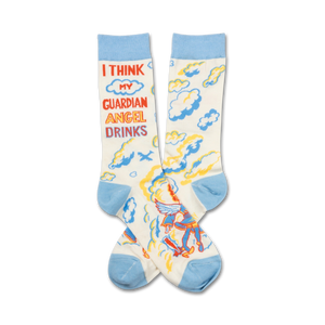Let's face it, guardian angels can be a bit of a handful. I mean, who hasn't wondered if their guardian angel has been hitting the sauce a little too hard? These cozy crew socks are just the thing to show your support for your guardian angel...or at least your sense of humor. The colorful cloud pattern and skateboarding angel make these socks perfect for anyone who loves a good laugh.