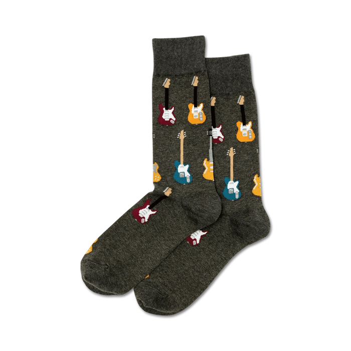 Look what we've got! Colorful socks that'll make you feel like you're playing the biggest rock concert in the world. Each pair is a crew-length masterpiece of dark gray and vibrant guitars in red, blue, yellow, and orange. Slip into these socks and get ready to strum the day away!