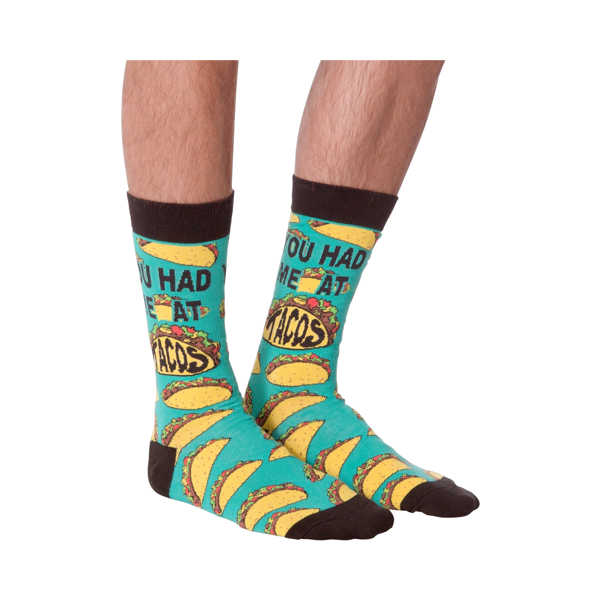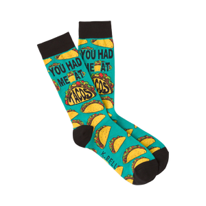 Don't let taco 'bout it, wear it! Accompany your next taco Tuesday get together with a snazzy pair of taco crew mens green and white cotton-blend novelty dress accessory. You'll have your fellow taco-holics green with envy and asking where you picked these spicy kicks up; you can tell them you 'taco'd' the opportunity to grab a pair at your local novelty sock shop. And remember, it's not just any taco; these fun dressy crew length kicks have the words 'You 'Taco'd Me At Tacos' printed across them so you can 'taco' 'bout your love of this tasteful treat, and maybe even get a late-night craving or two going with your foodie friends during a get together.